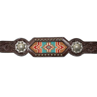 This noseband has the color and style you’re looking for with the turquoise, orange, red inlaid beads on rich, dark Walnut leather. Accented with antique conchos and silver spots.