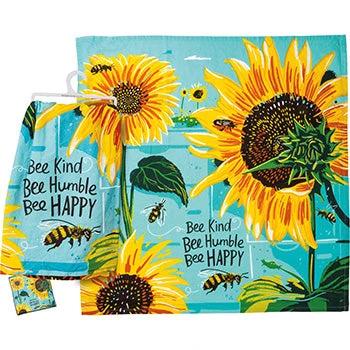 A full color cotton dish towel featuring a “Bee Kind Bee Humble Bee Happy” sentiment with bee and sunflower design.