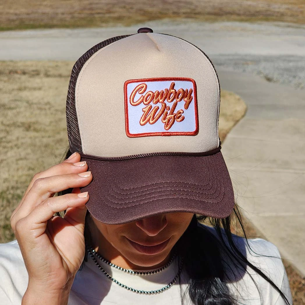 Where are all our proud cowboy wives at? This cute trucker style cap is tan and brown with that cute “Cowboy Wife ” patch. The back of this cap is brown mesh and has an adjustable snap back.Â