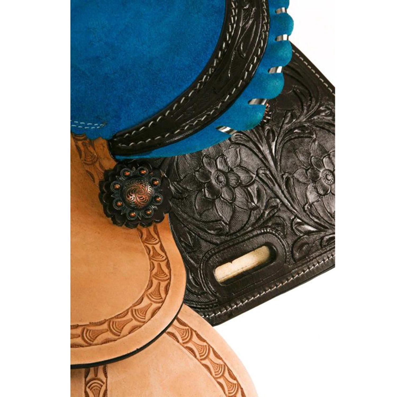 Look at the turquoise suede seat on this youth saddle made by Double T. It does have a floral tooling on the dark oiled skirt with light rough out jockeys and fenders.