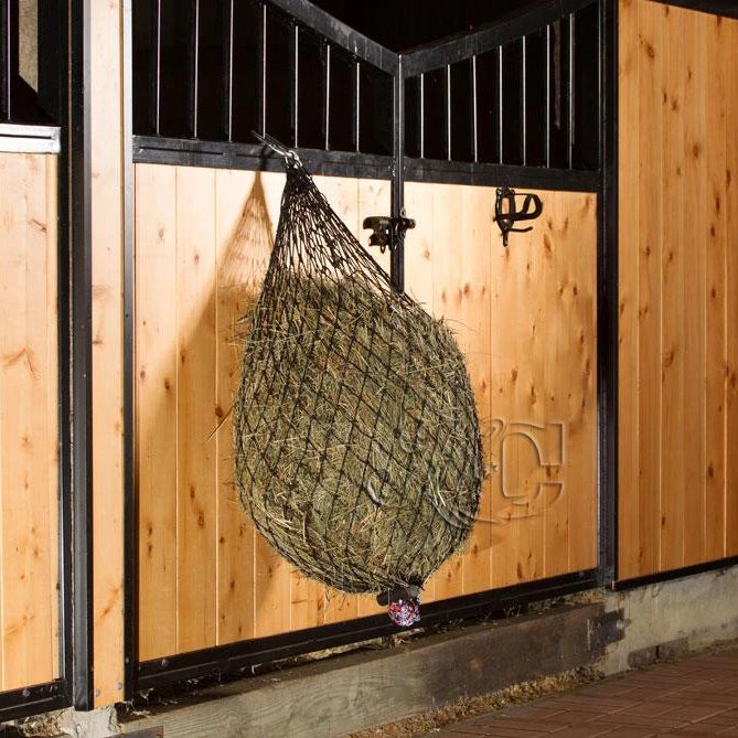 The Hay Chix Half Bale Net attaches easily to a trailer, eye hook, fence or tree, it’s perfect for feeding on the go. This net holds about 1/2 of a small square bale (4-6 flakes.)Â