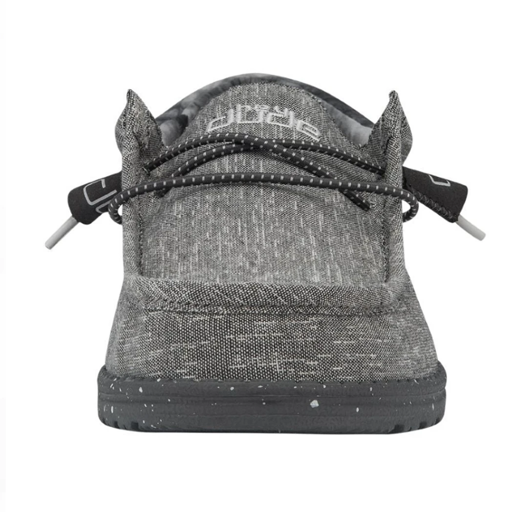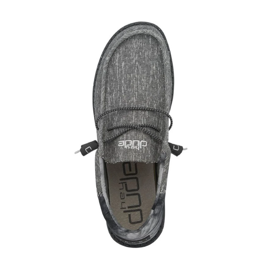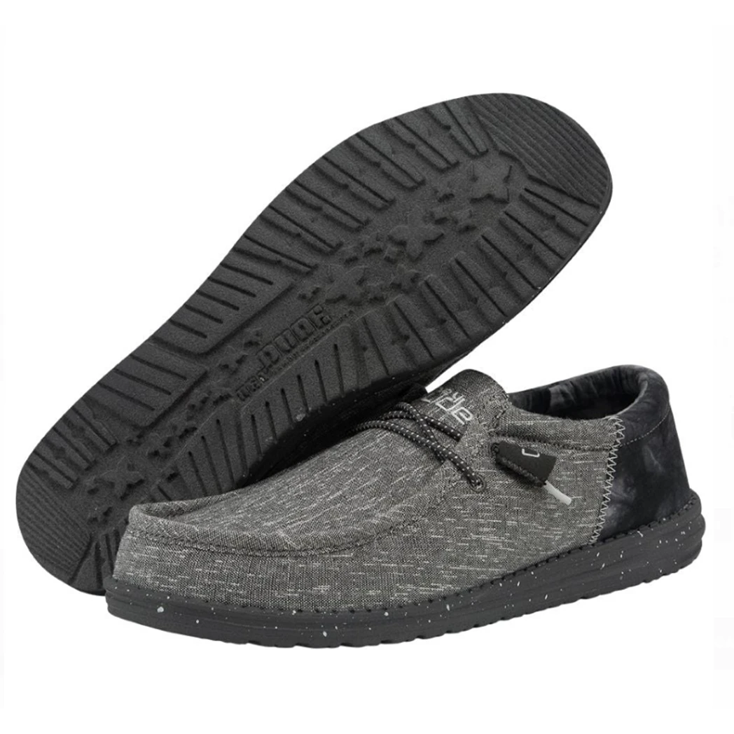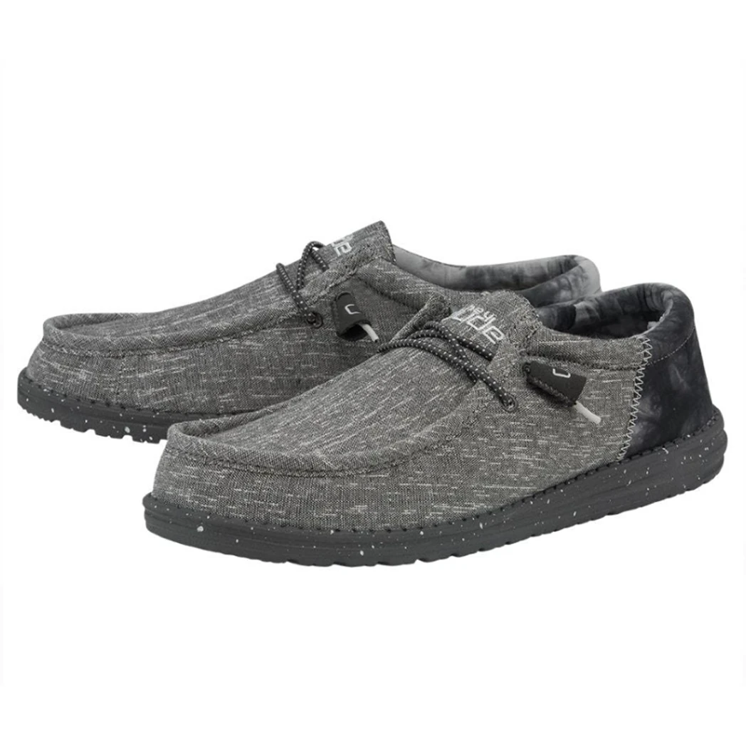 The Wally Funk Raven TieDye from Hey Dude is a great shoe. A modern look with the dark grey upper chambray blend and contrasting heel, featuring a black sole. This shoe features the Hey Dude easy-on system featuring elastic laces, with an ultralight outsole, known for all day comfort.Â