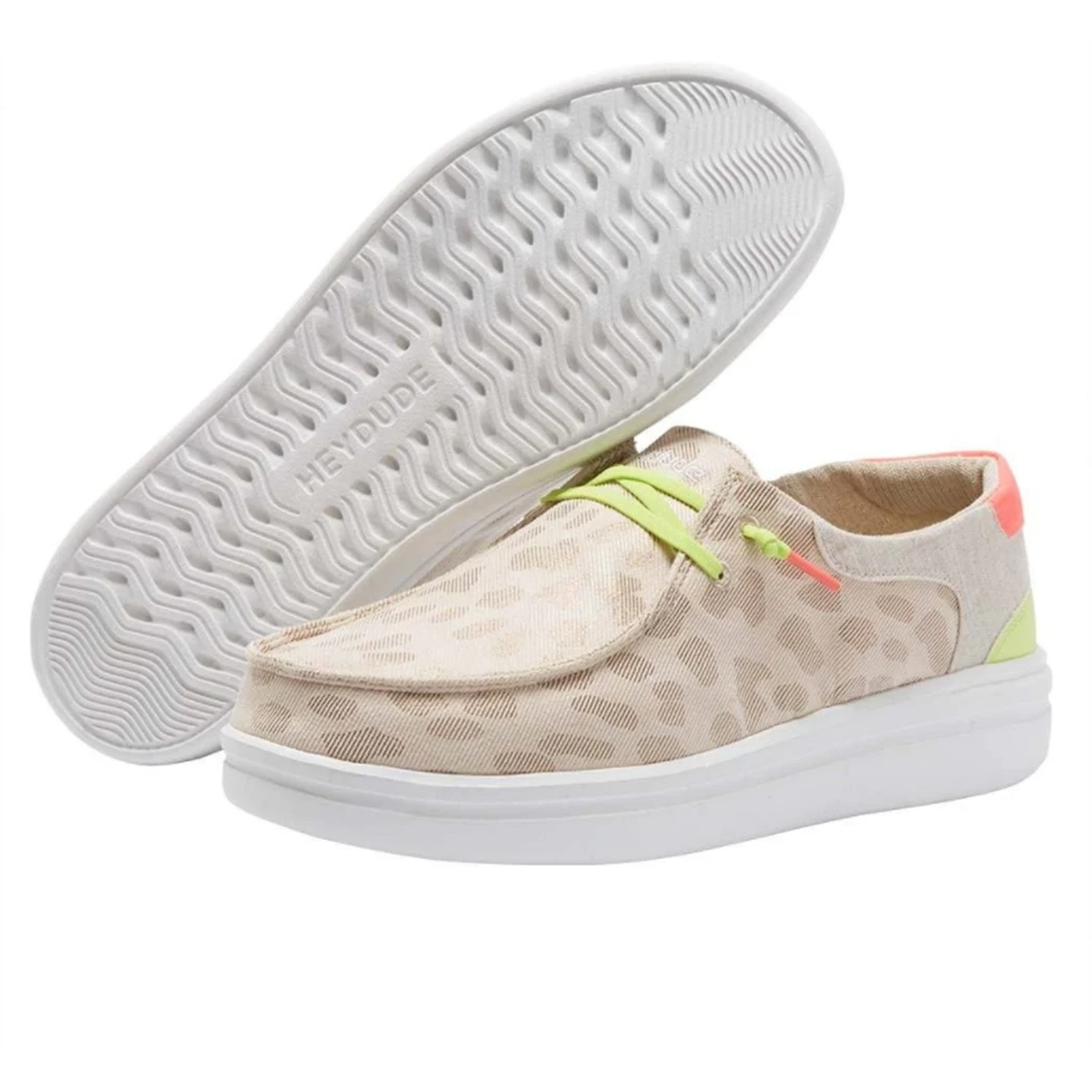 The Wendy Rise features the iconic low-top Hey Dude style with a little added heigth and a little extra cushion. This fun Leopard Neon Beige color is perfect for some spring and summer fun! They are still super lightweight and feature the Hey Dude patented UltraLIGHT EVA outsole for superior comfort.