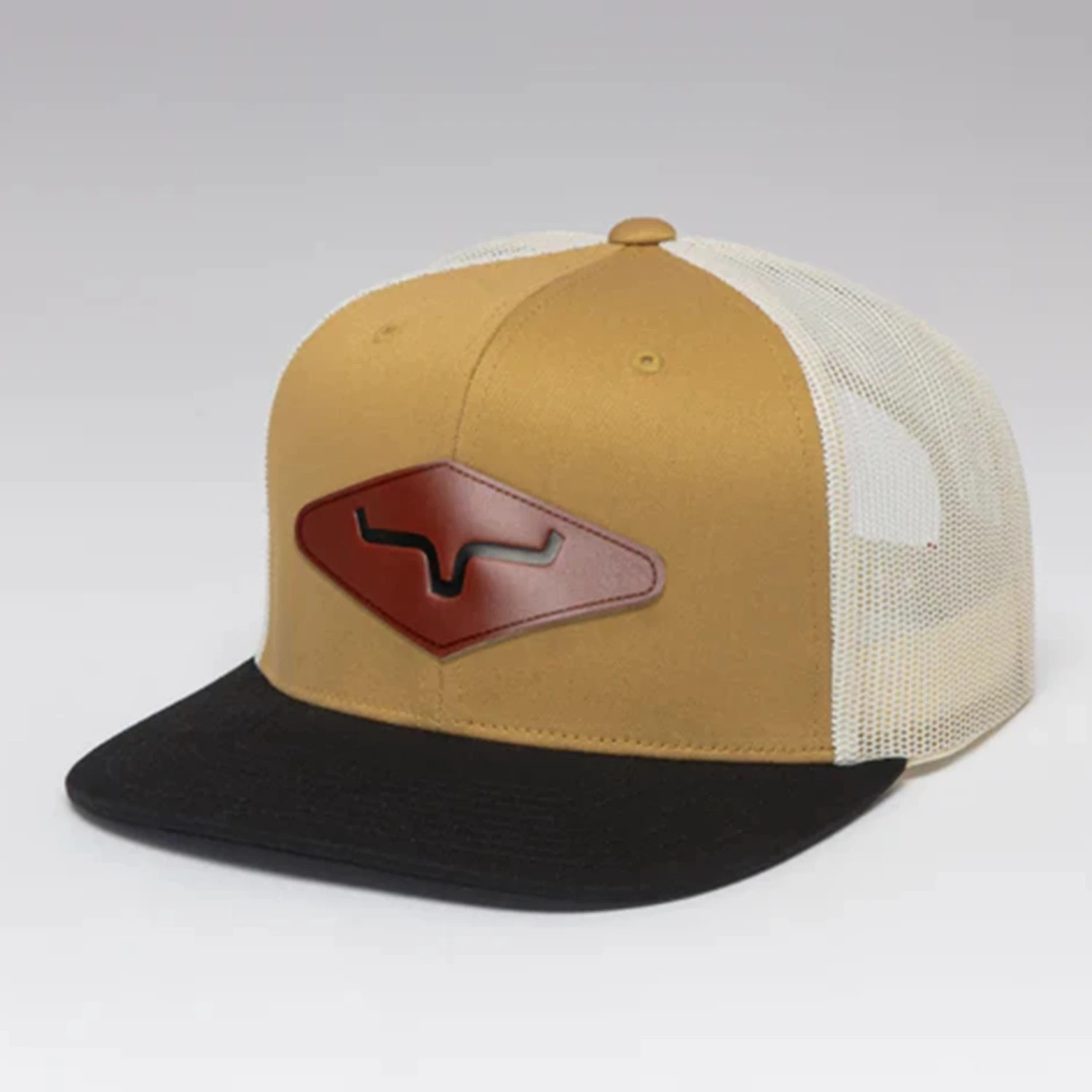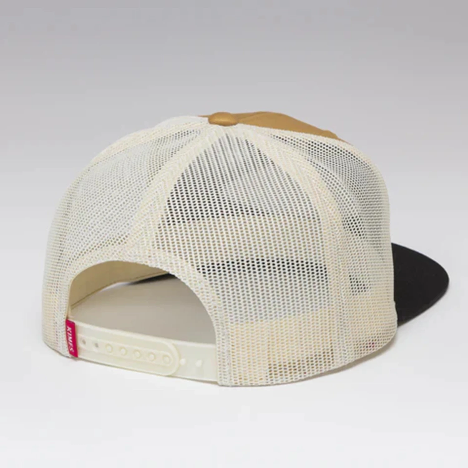 Kimes Ranch Yearly Trucker Cap is offered in a high-profile curved brim version with an adjustable backstrap for the perfect fit. The real leather patch has the Kimes Ranch brand!