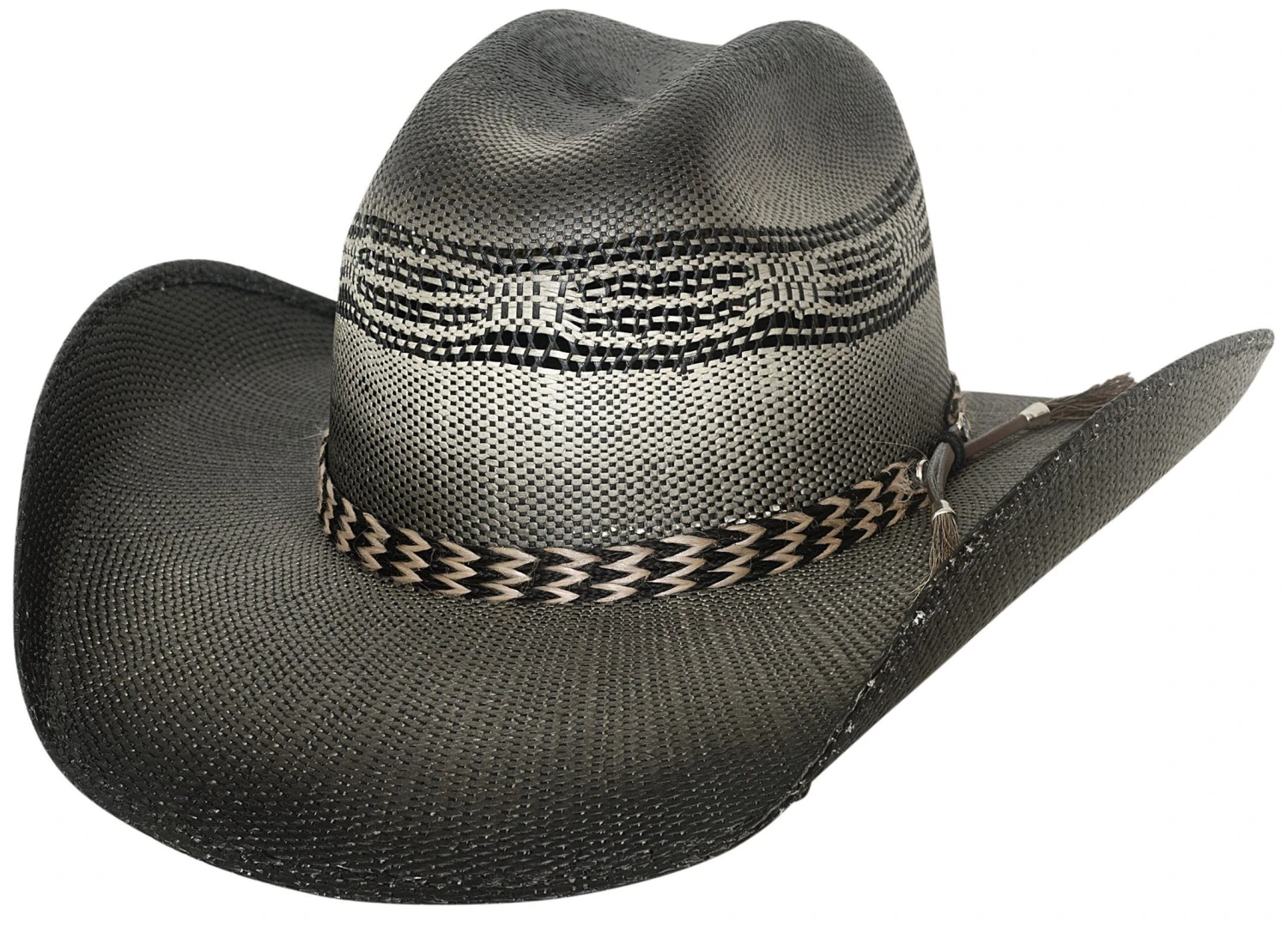 This raising sand features a two toned bangora straw with finishing touches of a chevron inspired faux horse hair and leather like hat band.Â