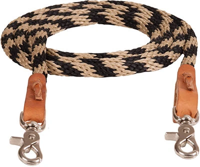 Round braided poly reins with leather water loop connectors and nickel plated trigger snaps.