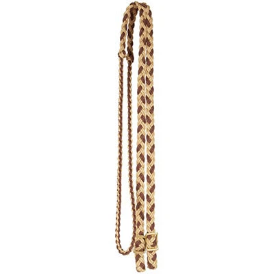 Flat braided nylon rein has two easy grip knots and features solid brass Conway buckles on each end. Â