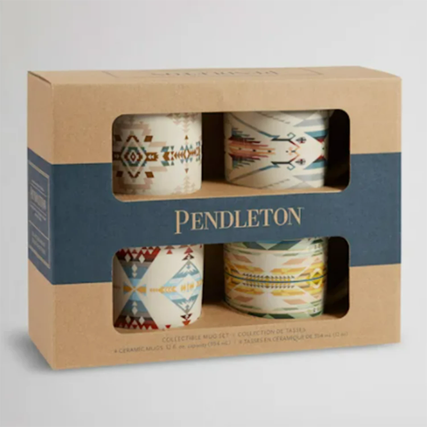 Pendleton High Desert Mug Set. This set features four, 12-oz mugs. Each mug features colors and patterns taken from a desert landscape; includes one mug in each design. Made from sturdy ceramic that’s dishwasher and microwave safe.