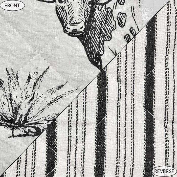 This fun ranch life bedding set is sure to add western style to any bedroom you add it to. With cowboys, longhorns, horses and desert touches it rustic western at its best. This set is reversible so if you want to change things up you can flip this over for a black and white stripe theme.Â