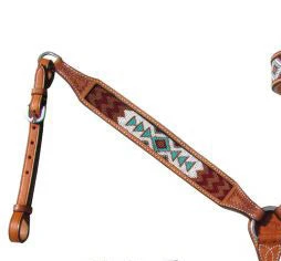 Argentina Cow Leather breast collar with Navajo beaded inlay. Features medium oil leather with teal, brown, burgundy, tan, and white navajo beaded inlay. Leather is accented with minimal tooling.