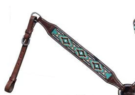 Argentina Cow Leather breast collar with Navajo beaded inlay. Features dark oil leather with teal, white, black, and gold Navajo beaded inlay. Leather is double stitched and smooth.