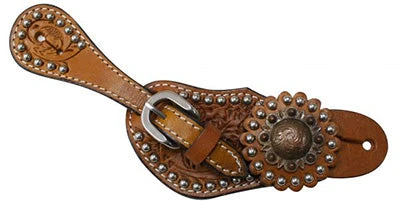 Youth silver studded spur straps with vintage rosette concho. These spur straps feature medium leather with oak leaf tooling accented with silver studs and a copper colored engraved rosette concho. Pre-punched adjustment 7.5″ to 8″.