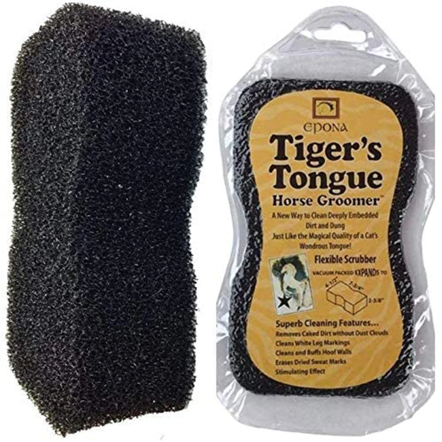 The Tiger’s Tongue is a multi-tasker that tackles, dirt, debris, and sweat marks with ease! It cleans deeply while providing your horse with a stimulating massage they will love. The Tiger’s Tongue wipes away caked on dirt and dander without dust clouds. Â