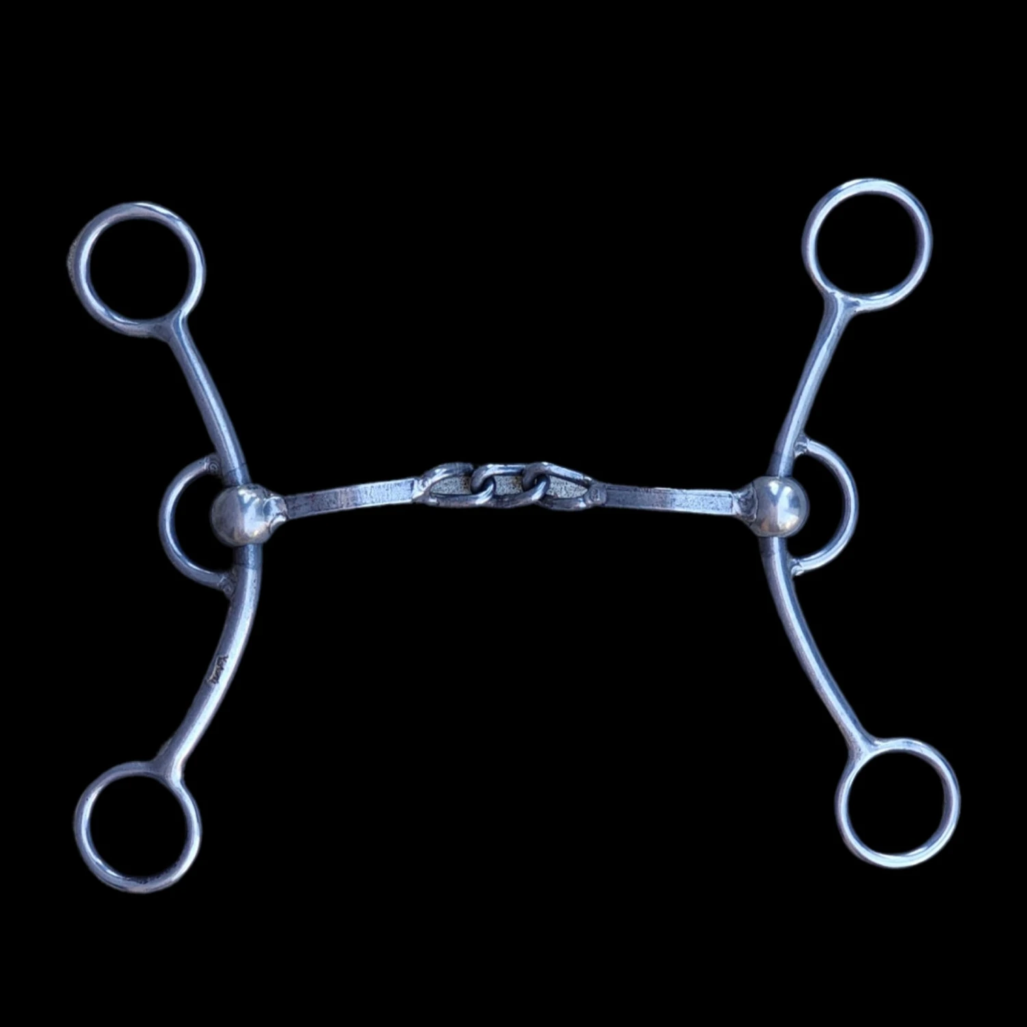 The Troy Flaharty “Marne” Cheek has a 1:1 ratio with very minimal gag for a quick reaction time. This bit fits a lot of hands and horses. This particular bit features a square with 3 link chain center.Â